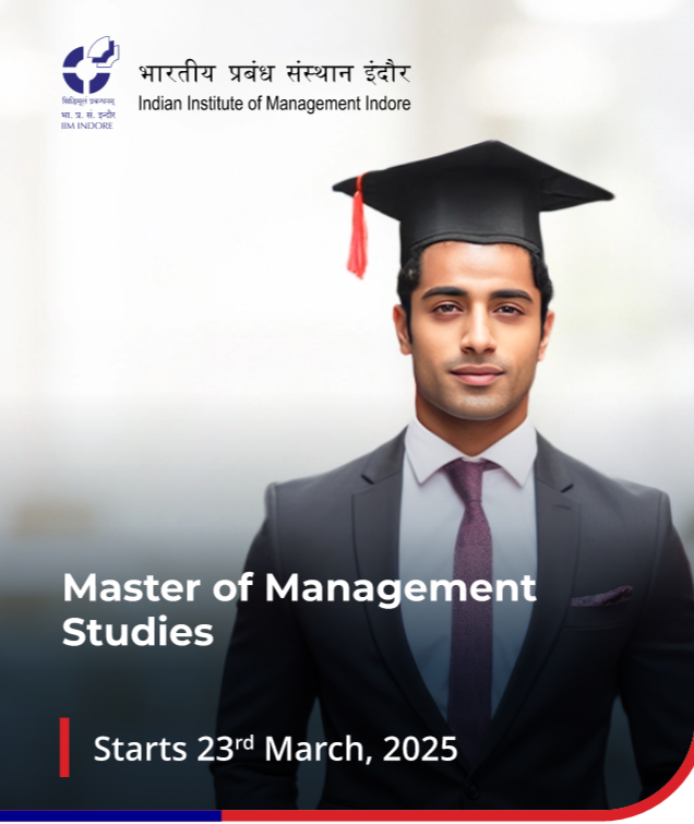 "A great leader not only masters the present but creates the future through foresight and innovation." IIM Indore's Master of Management Studies (MMS) is tailored for working professionals eager to advacne their careers while maintaining their current roles. This prestigious program combines top-tier managmenet education from India's 3rd ranked IIM with practical, real-world applications. It empowers you to enhance strategic decision-making optimise operational strategies, and strengthen financial management capabilities. The comprehensive curriculum spans strategic leadership, sustainability, marketing research and digital transformation, equipping you to navigate and lead confidently in today's dynamic business environment. MMS is your pathway to becoming a catalyst for innovation and growth within your organisation.